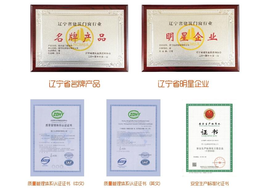 2014年,遼寧省建筑金屬結(jié)構(gòu)協(xié)會(huì)頒發(fā)遼寧省建筑門(mén)窗行業(yè)“名牌產(chǎn)品證書(shū)”、“明星企業(yè)證書(shū)”、鋁合金型材、鋁合金幕墻“定點(diǎn)生產(chǎn)企業(yè)證書(shū)”;